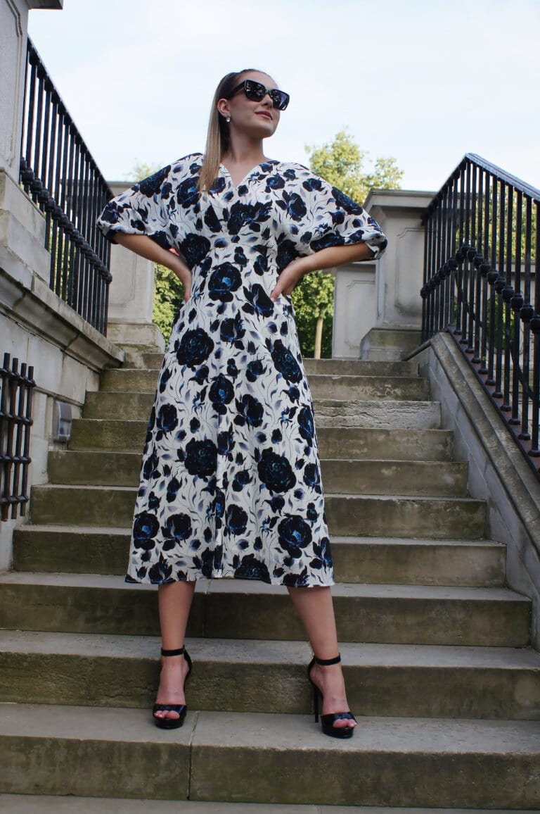 Biało-granatowa jedwabna sukienka w kwiatowy deseń z luźną górą