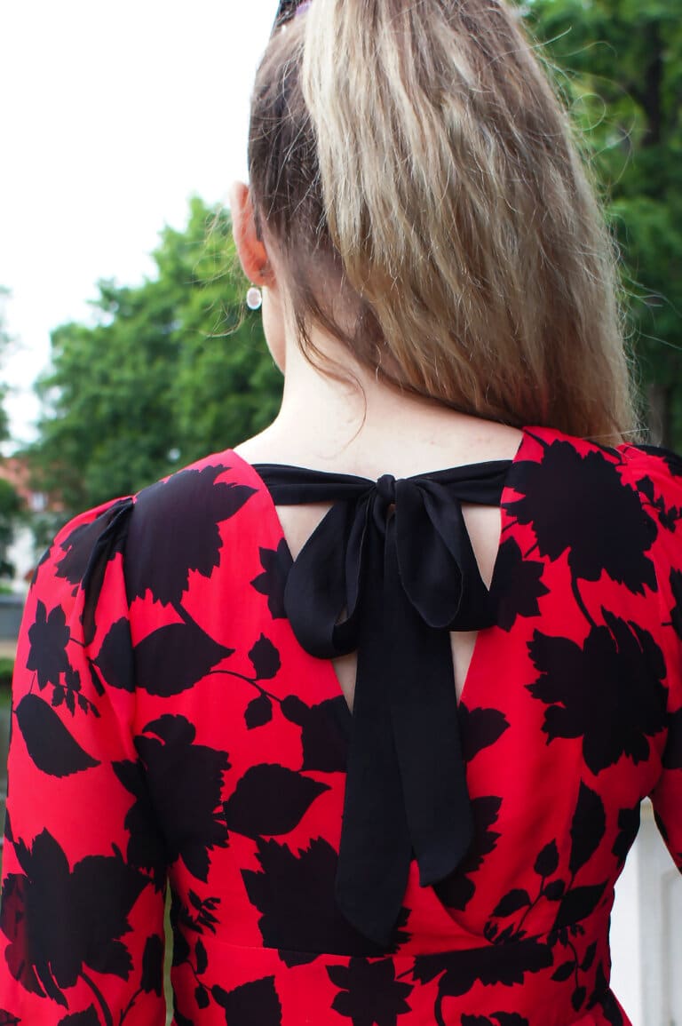 Dodatkowo, dekolt z tyłu dodaje sukience niepowtarzalnego wdzięku, delikatnie eksponuje plecy, dekolt jest wiązany na dwie szarfy. Ta elegancka sukienka w kwiaty na przyjęcie jest idealna na przyjęcia weselne, wieczorne wyjścia, romantyczne kolacje czy uroczyste okazje, która z pewnością przyciągnie spojrzenia i sprawi, że każda kobieta poczuje się pięknie i wyjątkowo.